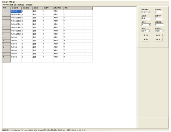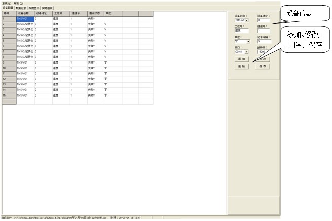 a、 添加設備:在界面右邊,選擇設備名稱,輸入設備地址、工位號、通道號、單位和記錄間隔,并選擇通訊串口和通訊波特率。其中,設備地址和通道號只能輸入數字。通訊波特率必須和下位機的波特率一致。點擊“添加”,添加設備成功并在左邊設備列表中最后一行顯示添加的新設備的信息。添加完所有設備后,記得要點擊“保存”按鈕,否則將不保存添加的設備信息。